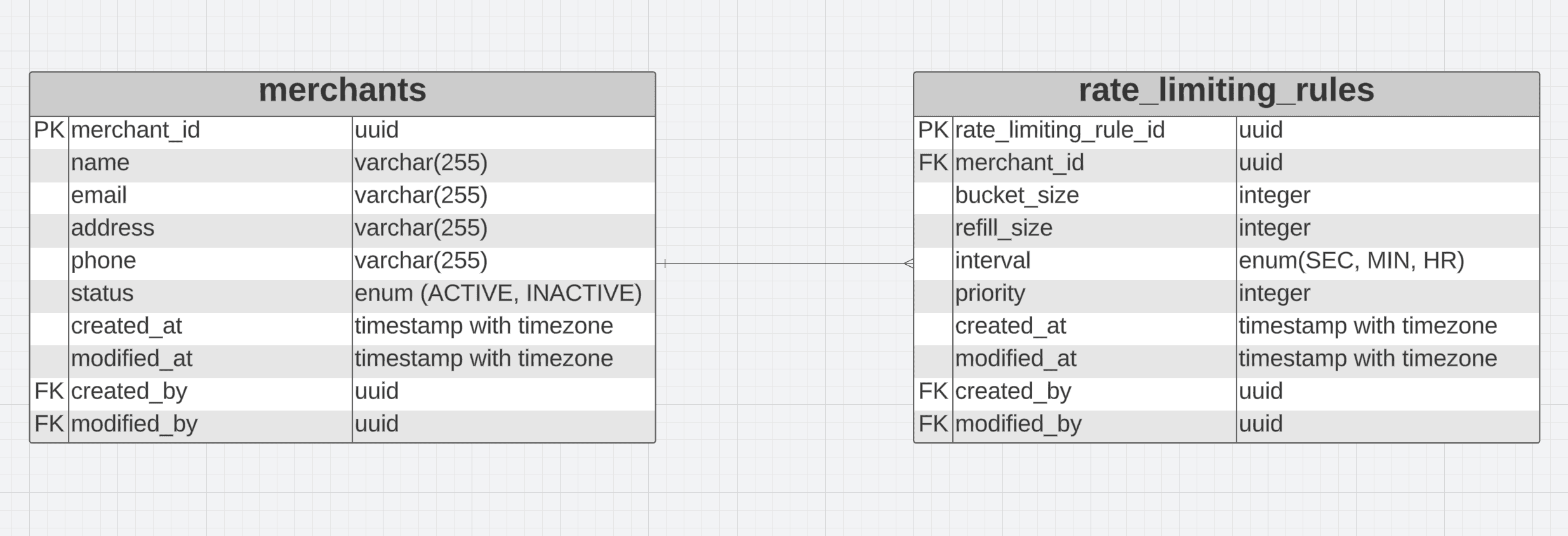 From the above ER diagram, we are storing one or more rate limiting rules per merchant which may have different priorities. Each merchant will be identified by an unique merchant id. Rate limits will be applied such that a rule with higher priority is chosen for a merchant.